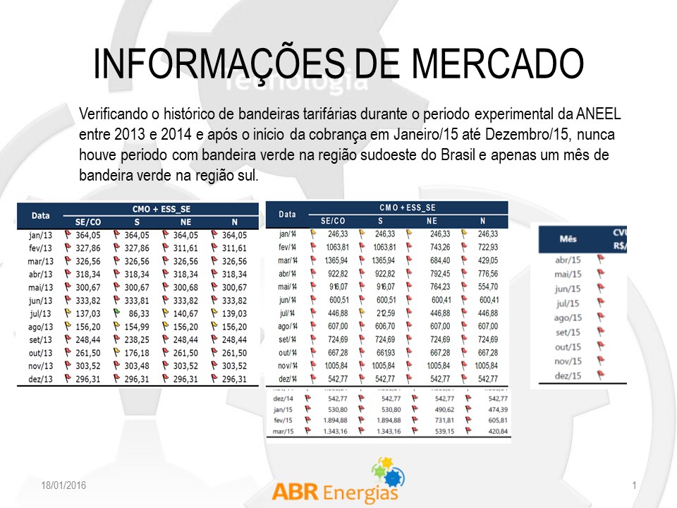 Os slides abaixo demonstram, utilizando dados provenientes do site da ANEEL (www.aneel.gov.br), os porcentuais de aumento, bem como o histórico da ocorrência de bandeiras vermelhas no período 2013 e 2014 (antes da cobrança) e durante o ano de 2015.
