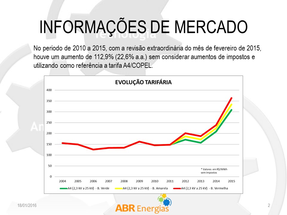 Está é uma análise rápida feita a partir da evolução no valor da tarifa de energia elétrica do grupo tarifário A4/COPEL, que pode ser extrapolada para outros contextos tarifários uma vez que desconsideramos a incidência de impostos (por exemplo, no Paraná, o PIS/ A COFINS subiu de 4,5% no final de 2014 para mais de 7% em 2015).